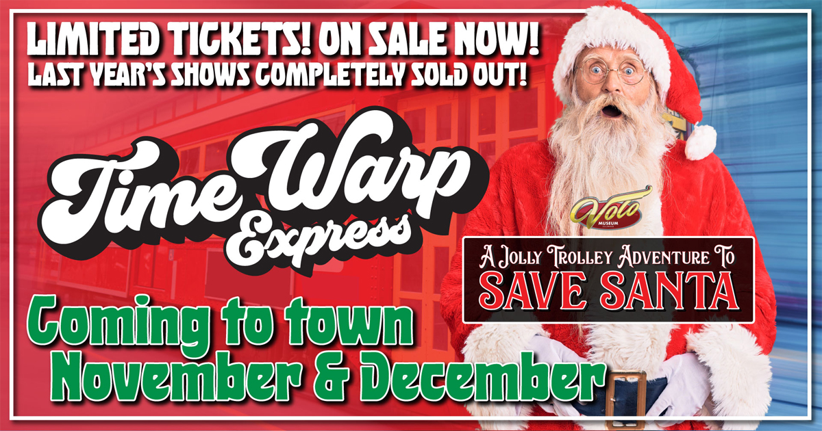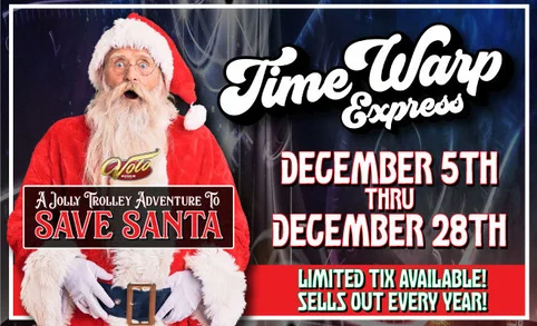 You’re invited to hop aboard the Time Warp Express for a Jolly Trolley Adventure to Save Santa at Volo Museum.